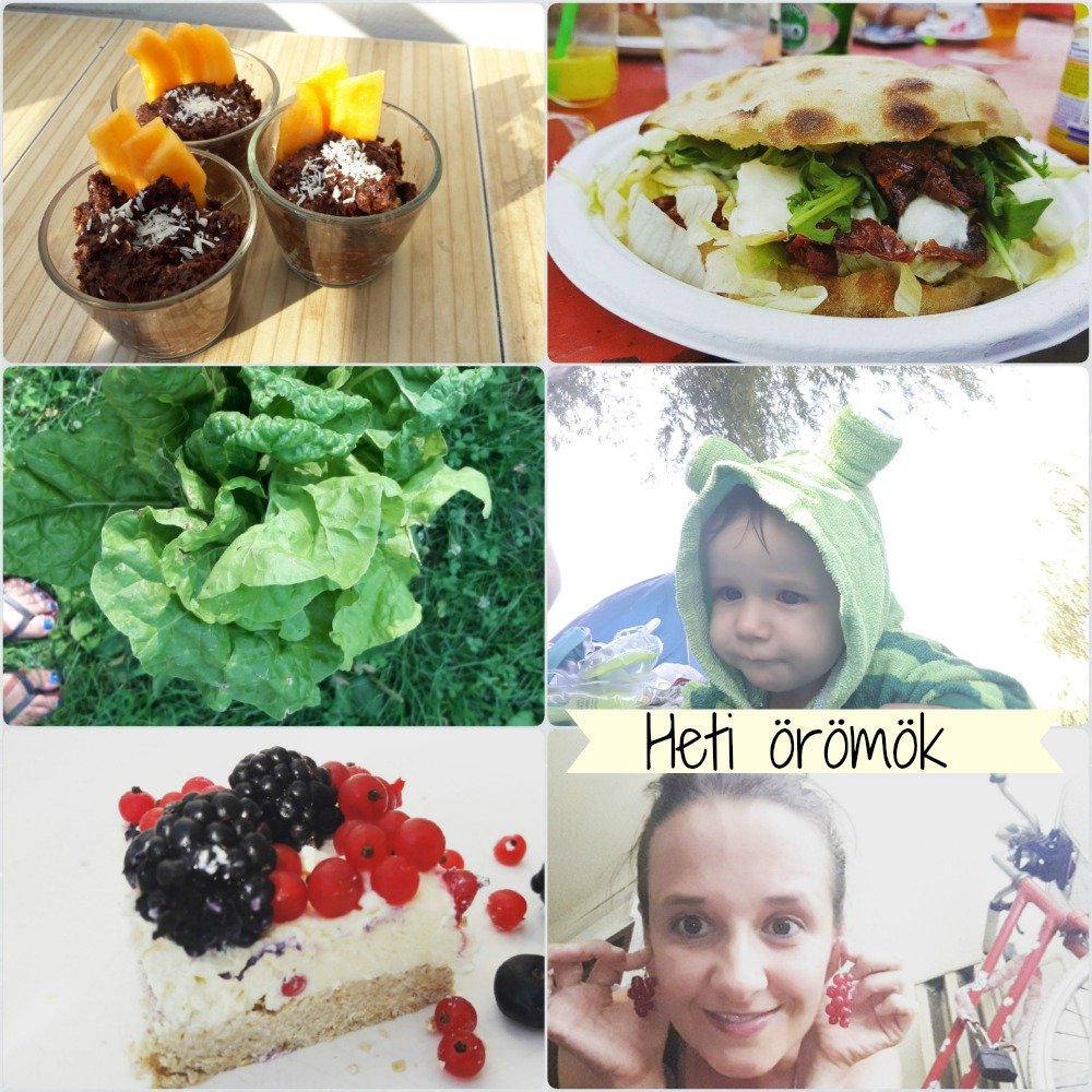 ♥ Telis-tele volt a hét finomságokkal, mert a nyár már csak ilyen. Készítettem vendégváró datolyapudingot. Úgy készül, hogy a vízbe áztatott datolyát össze kell mixelni kakaóval, édesítővel, kókuszolajjal, rumaromával és egy kevés zabpehellyel. Ha formába öntöd, és fagyasztóba teszed a masszát, akkor vágható állagú, nyers brownie is lehet, ha pedig a hűtőben hagyod keményedni, akkor kókuszgolyót tudsz formázni belőle. Ez az egyik kedvenc gyors édességem. Készítettem még túrótortát. Sej ribizli a fülbevalóm, és a piros bicikli mögöttem a képen. 🙂 Receptet itt találtok hozzá. Aztán beszereztem egy nénitől a piacon egy csokor gyönyörű zöld színű mángoldot. Kolos még nem evett spenótot, de azt nem is kaptam frissen, ezért ezzel helyettesítettem. Bulgurral, fokhagymával és anyatejjel főztem össze, pürésítettem. Befalta. 🙂