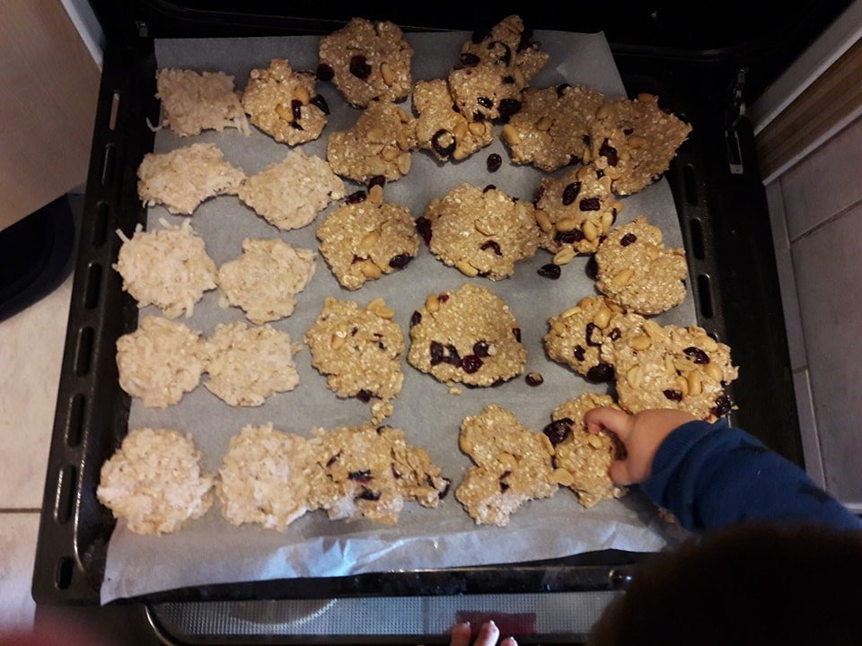 Nem szoktam már Kolosnak külön főzni, sütni. Szinte mindent megeszik, amit mi, maximum magunknak utána fűszerezzük, sózzuk az ételeket, vagy egy kicsit változtatok az alapanyagokon. Ez történik, akkor is, amikor kekszet gyártok. Egy sütőben sül ki a babakeksz és a felnőttkeksz is. Az alapja mindkettőnek a zabpehely és a teljes kiőrlésű tönkölyliszt. A babakeksz puha textúrájú lesz a félrenyelés veszélye és a hiányos fogsor miatt, a felnőtteké pedig finom, ropogós. Az előbbit majd uzsonnára adom az éppen alvó munkás Józsinak, az utóbbi pedig az én jussom az anyaidős tejeskávém mellé (éppen most fogyasztom). Egyébként mindkét recept annyira egyszerű, hogy egy kicsit szégyenlem leírni, de azért tessék-lássék: